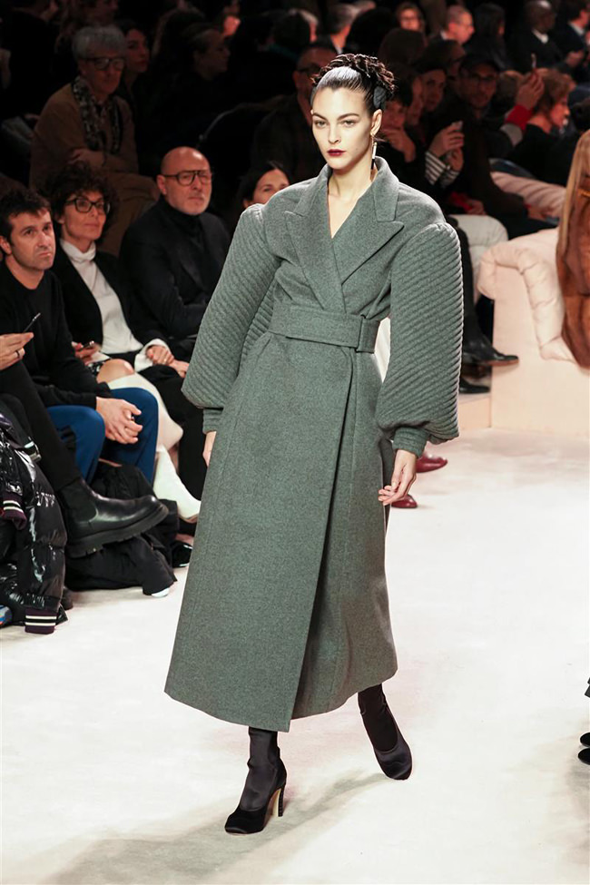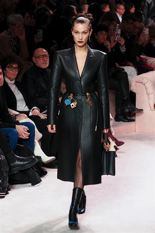 Fendi brings outfits that empower women, with puffed sleeves and curved necklines, as well as different materials such as leather suits and velvet dresses.