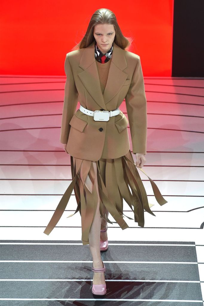 Prada played with the duality of masculinity and femininity, creating work suits for women with formal ties, turning basketball jerseys into dresses and ripping long skirts to show the models’ legs, demonstrating that even the more “manly” menswear can appear delicate and feminine.
